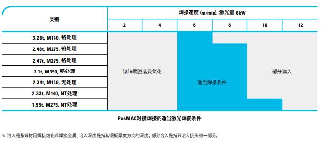 以下表格是根据钢材厚度和镀锌附着量的适当焊接速度区间。评估对象之外其他钢种,需要另行制定焊接条件。
